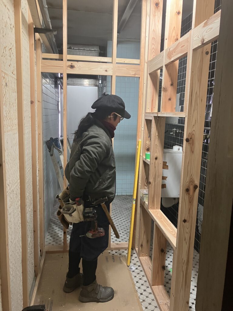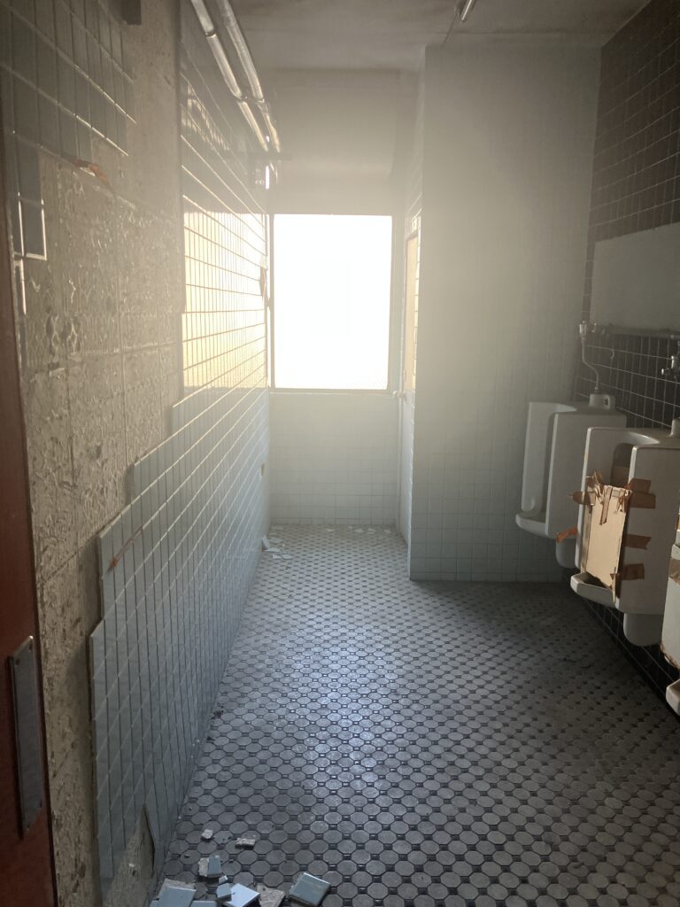 古いビル内のトイレ。配管の老朽化に加えて、タイルが落ちてきて危険なため使用禁止となり長い期間が経過していました🚽ただ、復旧するにもこのタイルをすべて剥がして新しく壁にするにはお金がかかりすぎてしまう。そもそもこんなに広いトイレはもういらない…😣ということで!