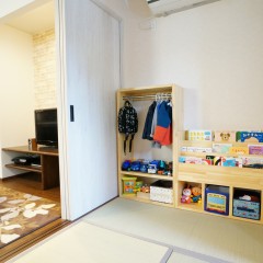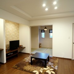 縦に並べた和室・リビング・ダイニングキッチンは、キッチンに立ったときに家族の姿がよく見える配置となっています。